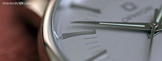 Offrant plus de détail est le cadran, disponible en gris foncé ou de l'argent (en photo ici). Légèrement bombé, le cadran a un grain fin arrivée avec une forme inhabituelle heure marqueurs. La courbe des marqueurs de bâton vers le haut en direction du centre du cadran, un contraste agréable à la courbe vers le bas du cadran.
